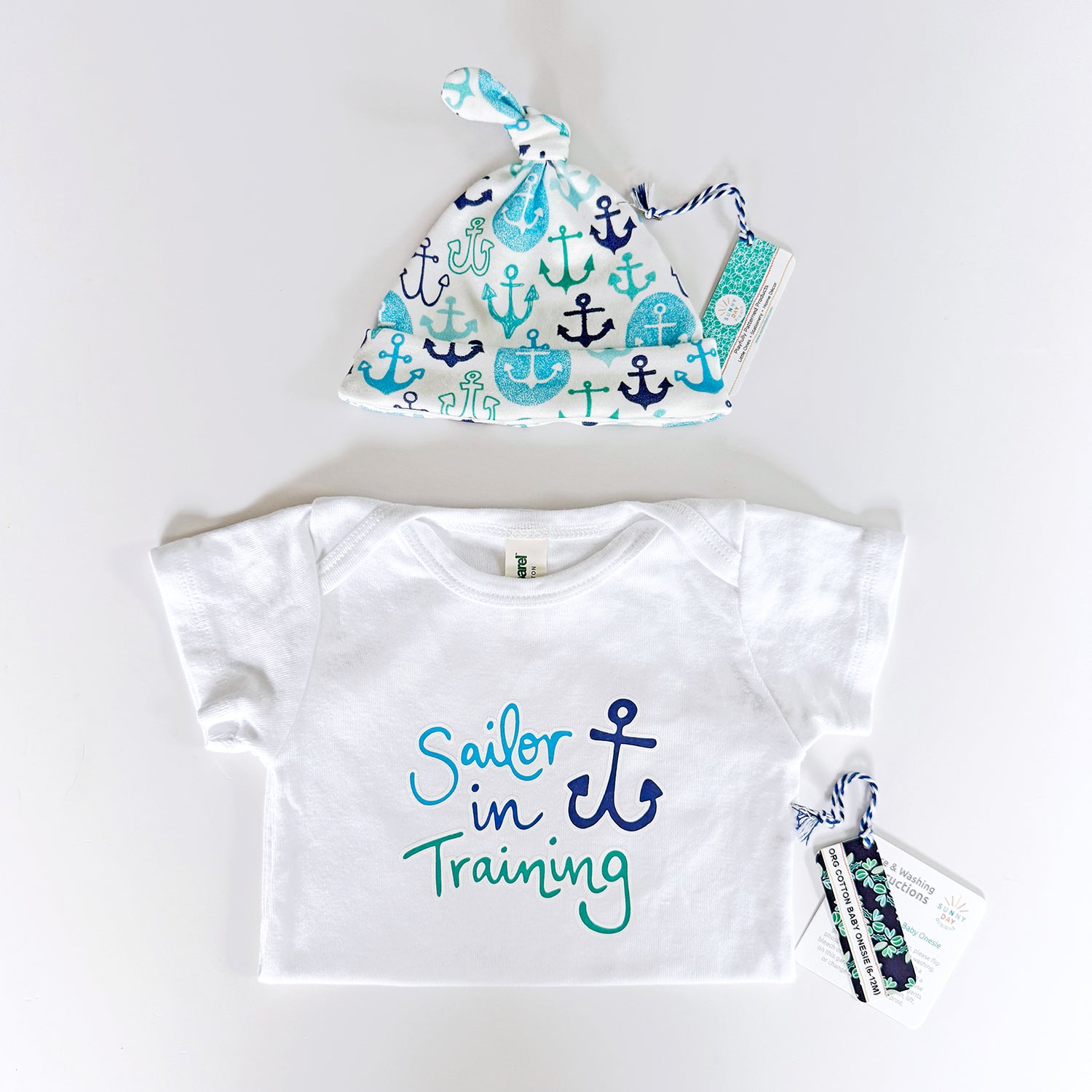 This organic baby gift set includes both our Sailor In Training organic cotton baby onesie (in a 0-3M size) and our handmade Anchors Away printed organic cotton newborn baby hat (sized to fit 0-3M newborns).