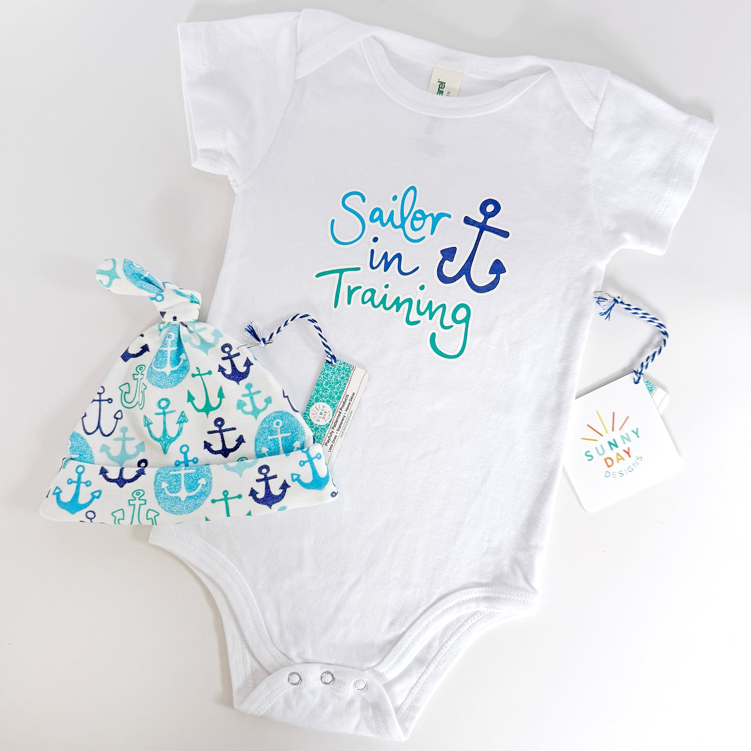 Please note that our newborn gift sets are intended to fit newborn babies only (sizes 0-3M). If you would like to order our Sailor In Training baby onesie in a larger size, please click here.